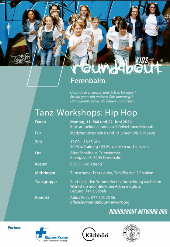 An den beiden Montagen, 8. Mai und 22. Juni findet jeweils ein Tanzworkshop für Mädchen bis zur 6. Klasse im alten Schulhaus Ferenbalm statt.
